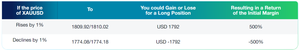 You decide to buy 100 oz of XAUUSD (1Lot of XAUUSD) because you think that the XAUUSD price will rise in the future. Your margin rate is 0.2% (Account Leverage 500:1) . This means that you need to deposit 0.2% of the total position value into your margin account.